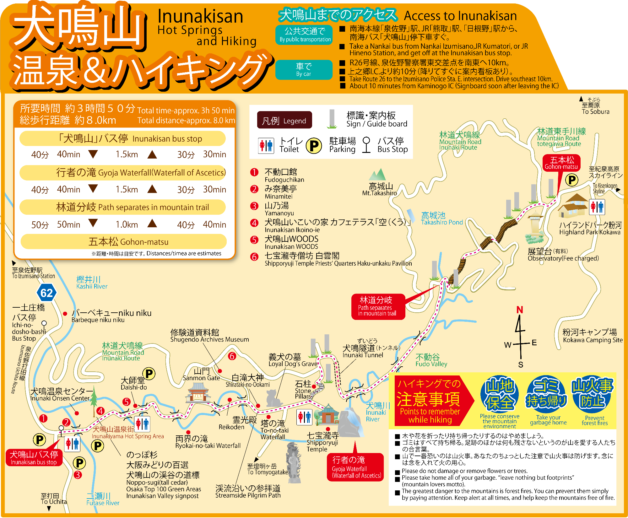 犬鳴山バス停 (40分・1.5キロメートル) 行者の滝 (40分・1.5キロメートル) 登山道と林道の分岐 (50分・1.0キロメートル) 五本松 (70分・3.0キロメートル) 和泉葛城山